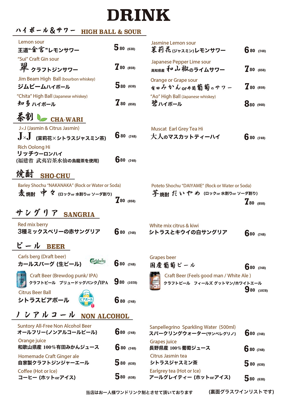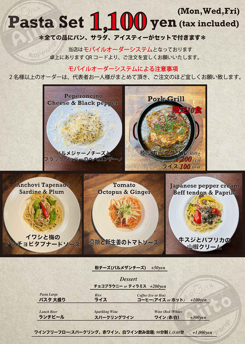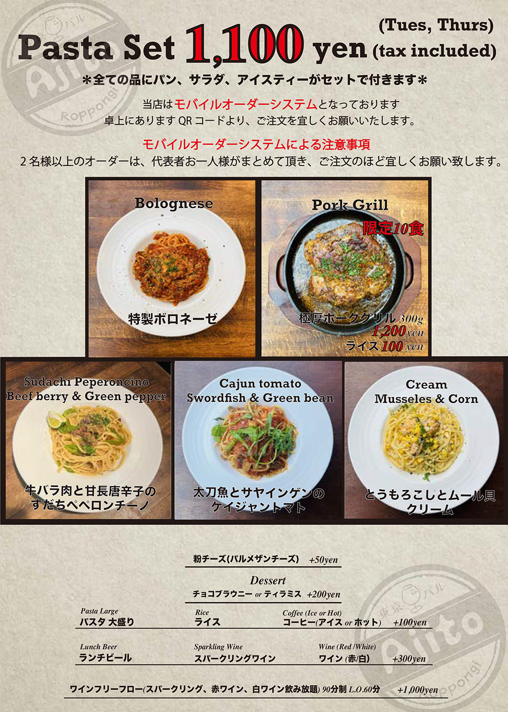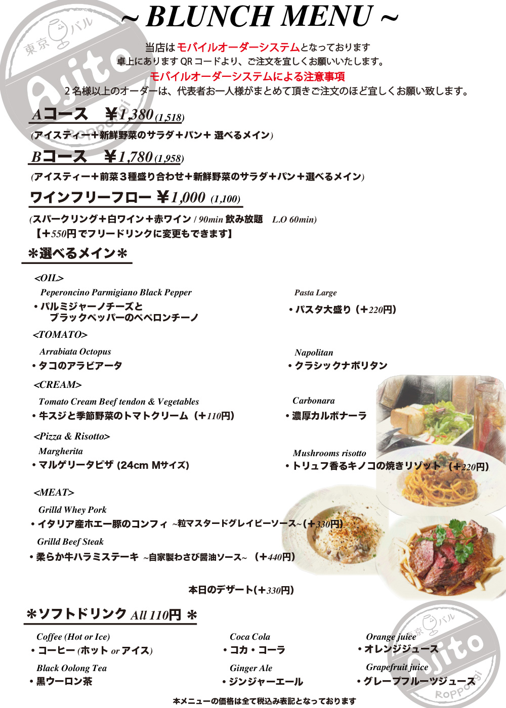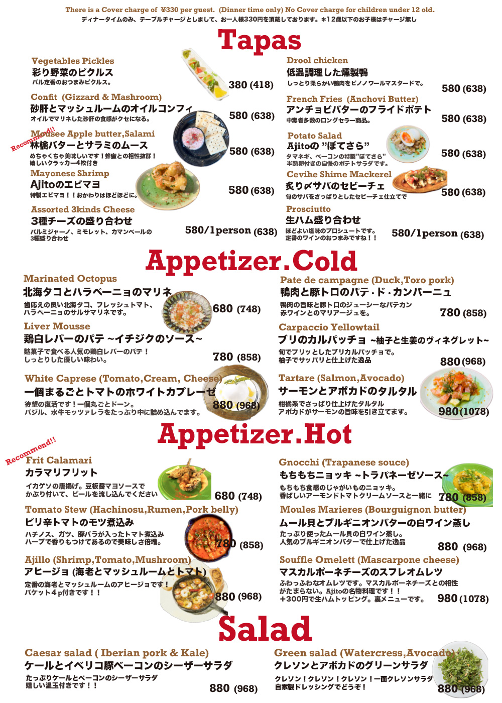 ・ご連絡無しのキャンセルはキャンセル料を頂戴いたします ・ディナータイムのみテーブルチャージお一人様330円を頂戴しております There is a Cover charge of ¥330 per guest.(Dinner time only) ※12歳以下のお子様はチャージ無し No Cover charge for children under 12 years old. ※コースにはチャージが含まれております Course meals include a Cover charge. |