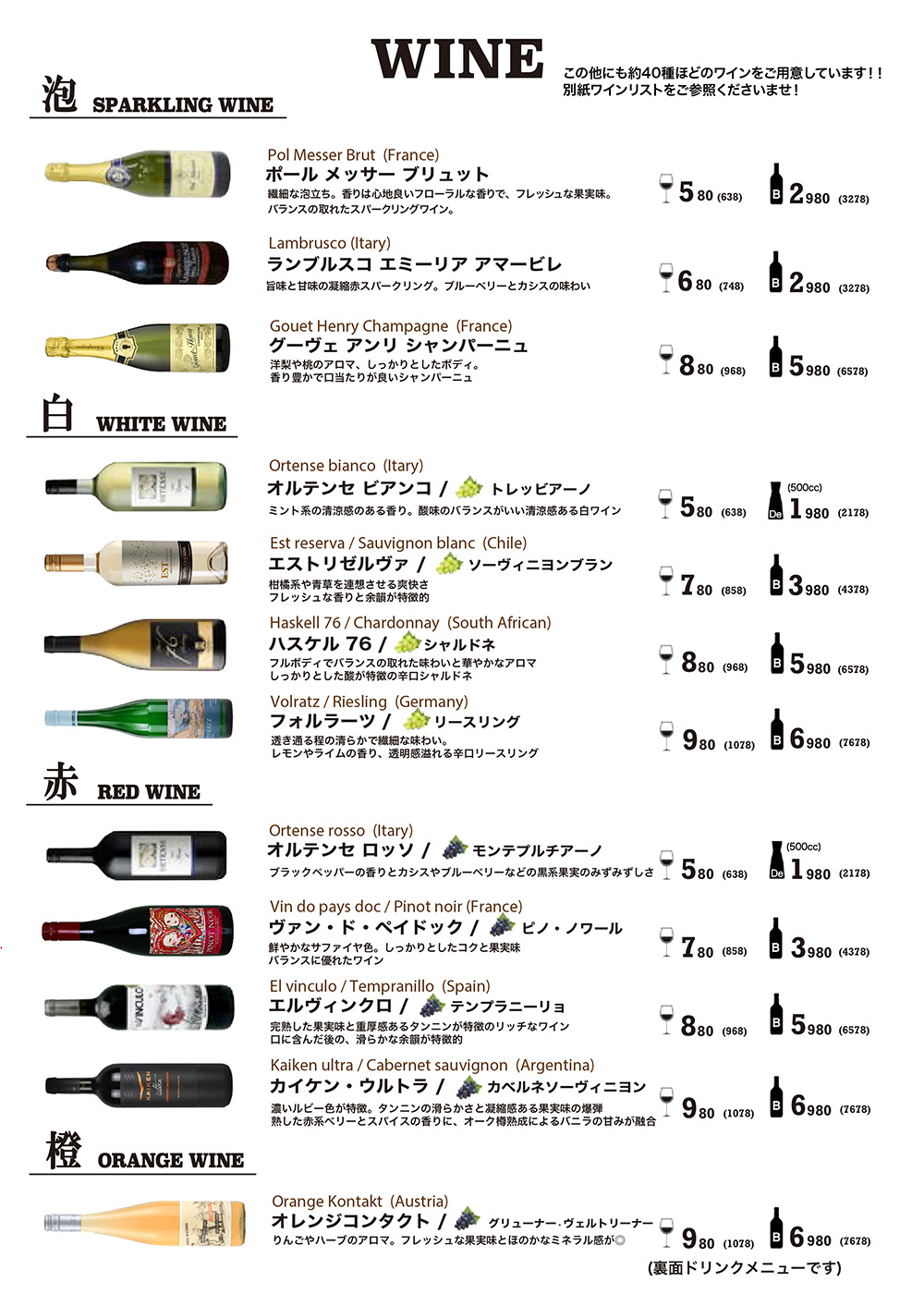 ボトルワインは2,980円から60種類の世界各国の安旨ワインが揃っています