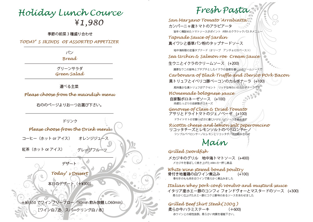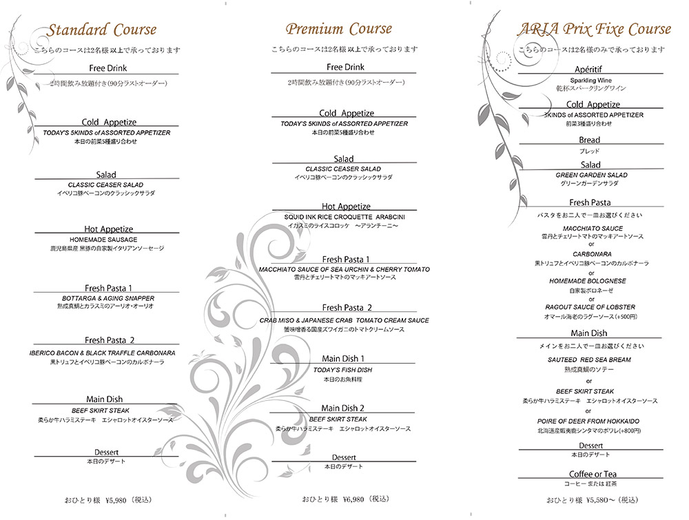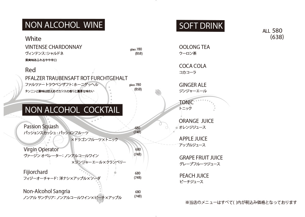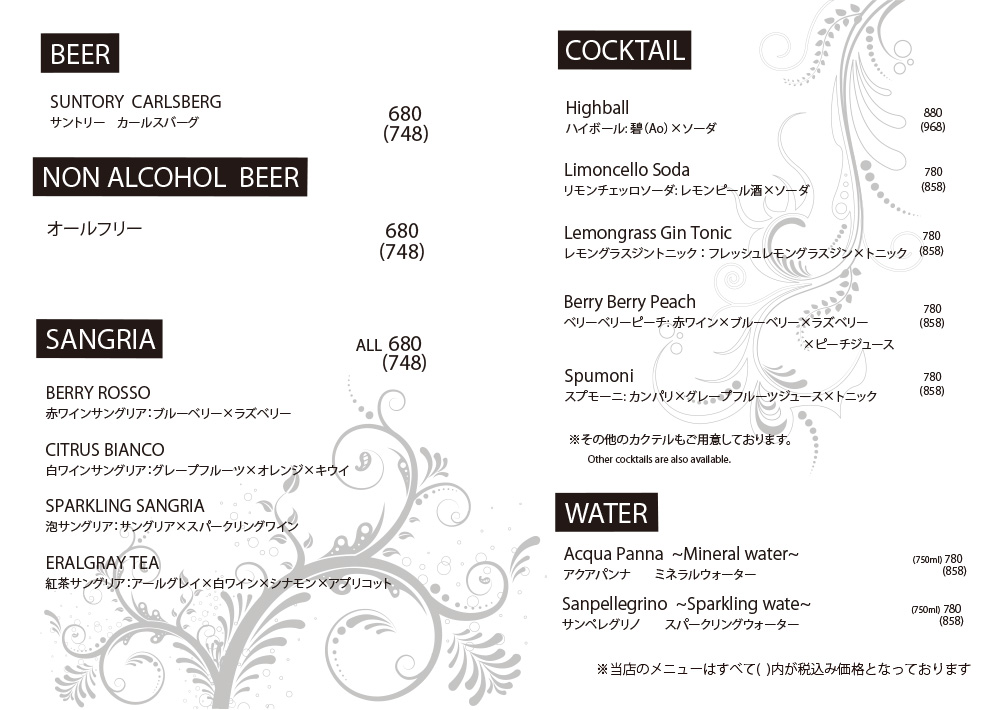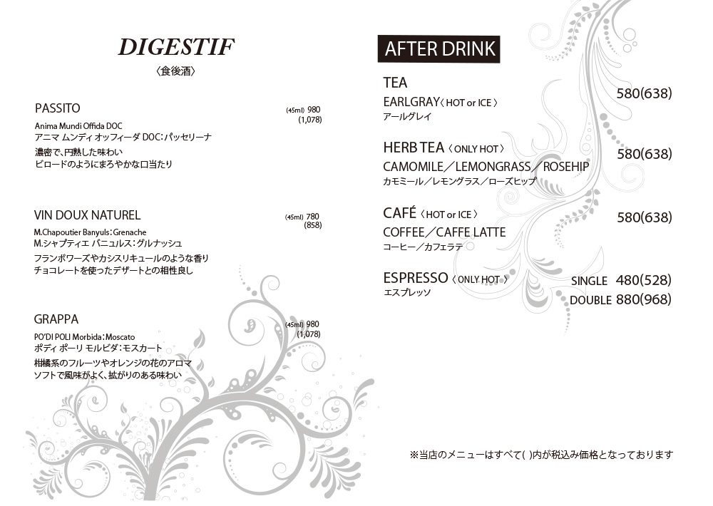 ・ご連絡無しのキャンセルはキャンセル料を頂戴いたします ・ディナータイムのみテーブルチャージお一人様330円を頂戴しております There is a Cover charge of ¥330 per guest.(Dinner time only) ※12歳以下のお子様はチャージ無し No Cover charge for children under 12 years old. ※コースにはチャージが含まれております Course meals include a Cover charge. |