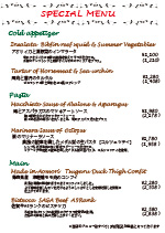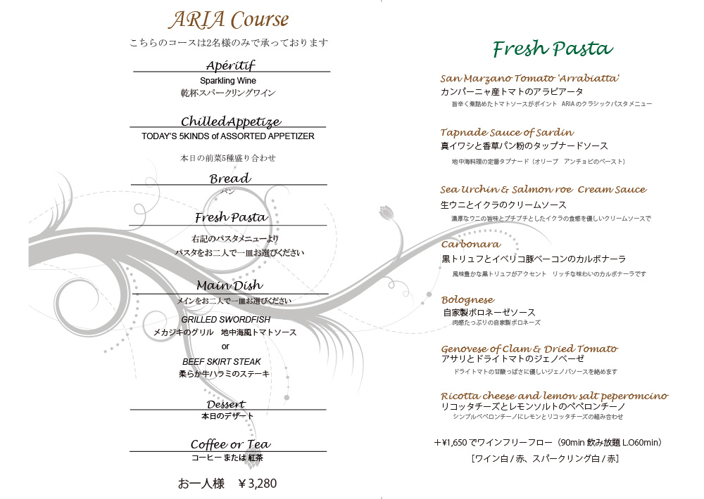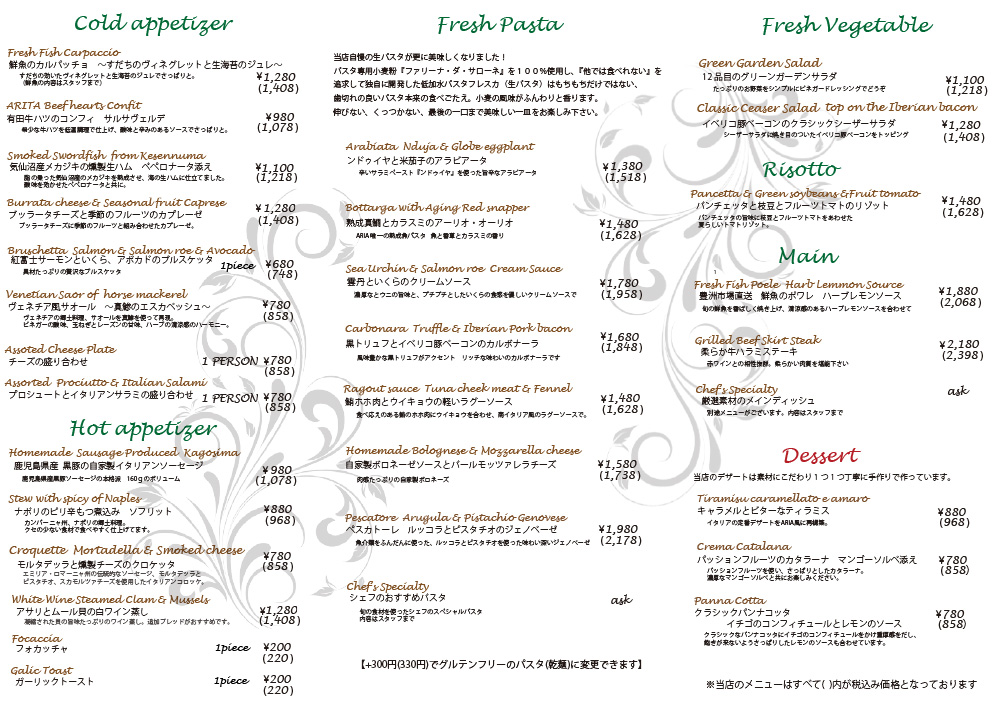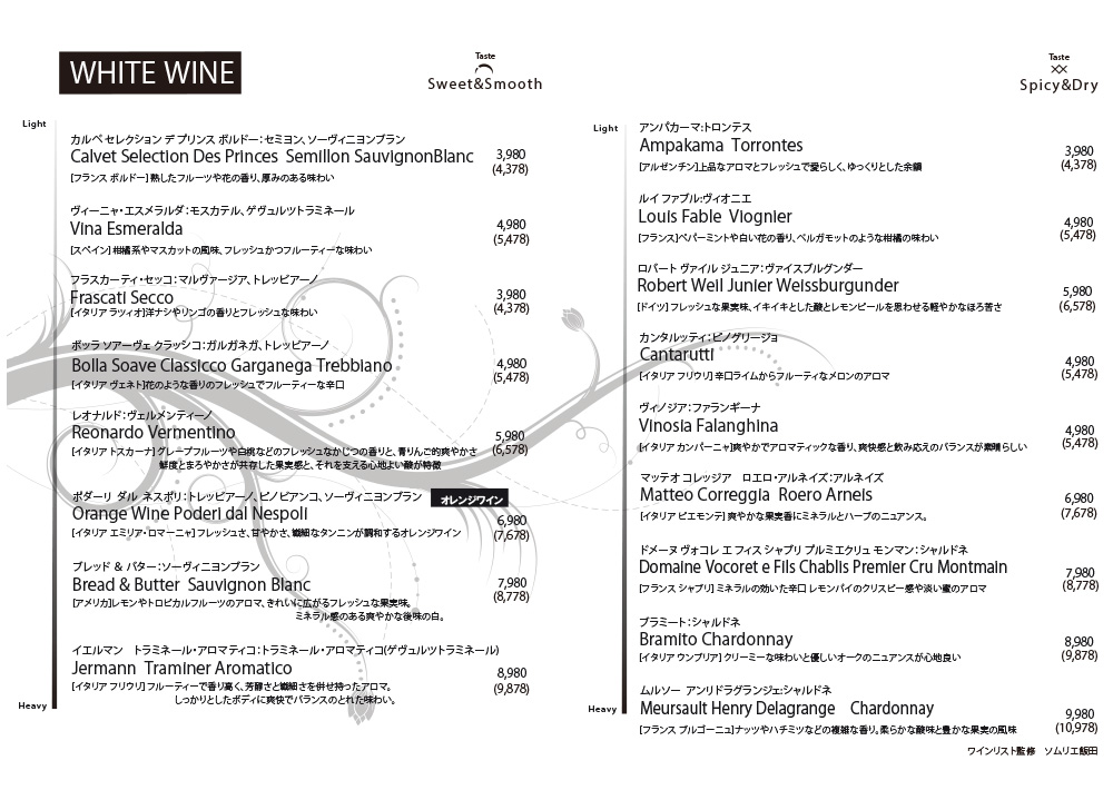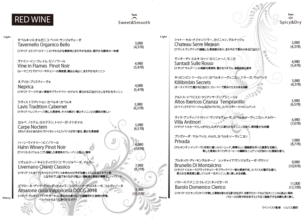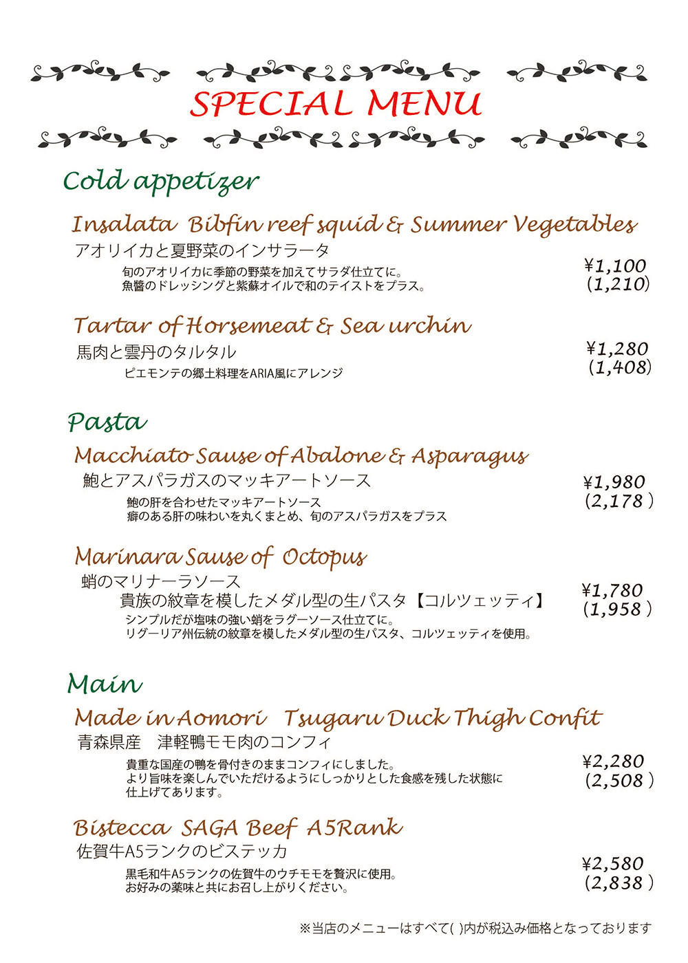 ・ご連絡無しのキャンセルはキャンセル料を頂戴いたします ・ディナータイムのみテーブルチャージお一人様330円を頂戴しております There is a Cover charge of ¥330 per guest.(Dinner time only) ※12歳以下のお子様はチャージ無し No Cover charge for children under 12 years old. ※コースにはチャージが含まれております Course meals include a Cover charge. |
