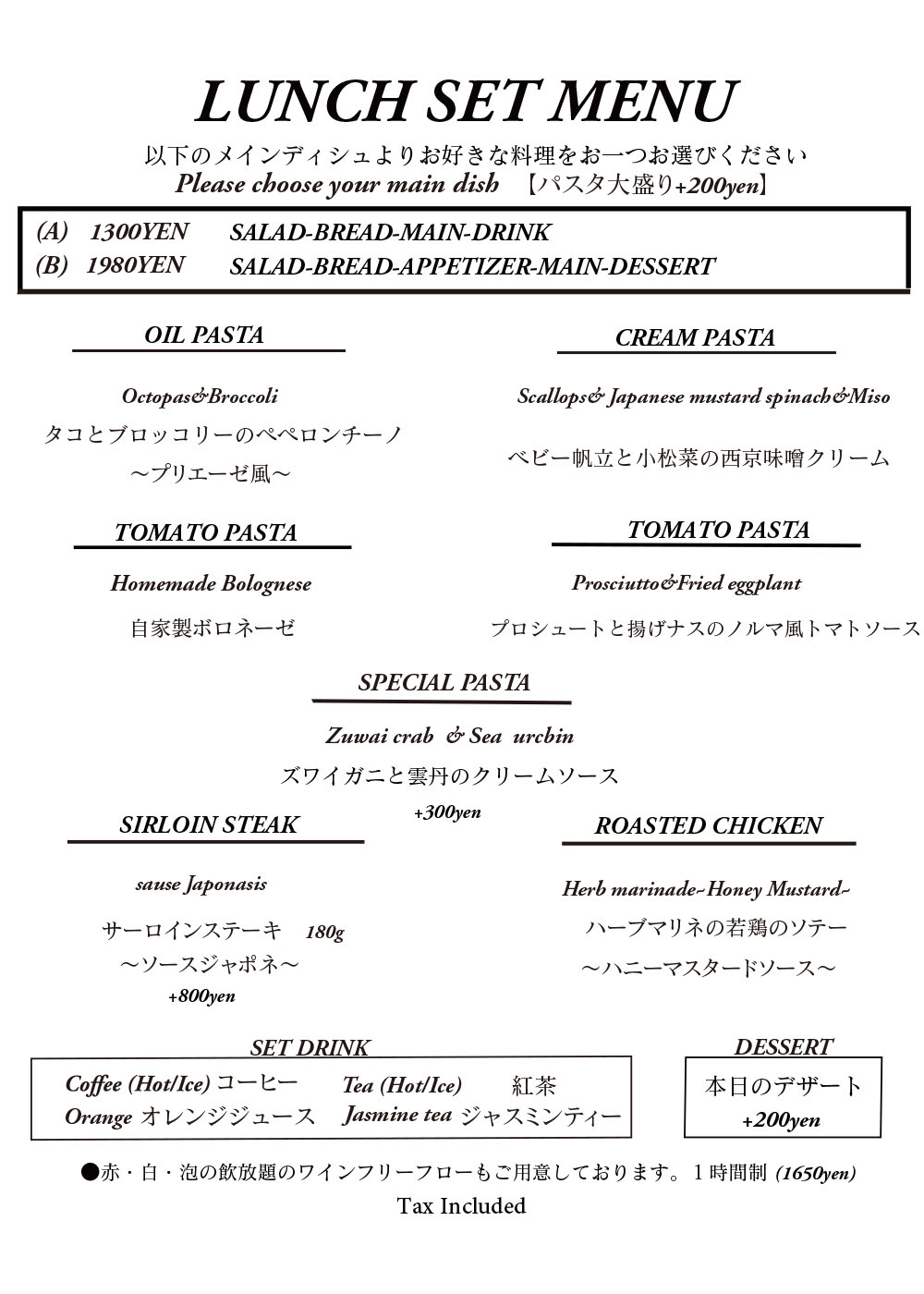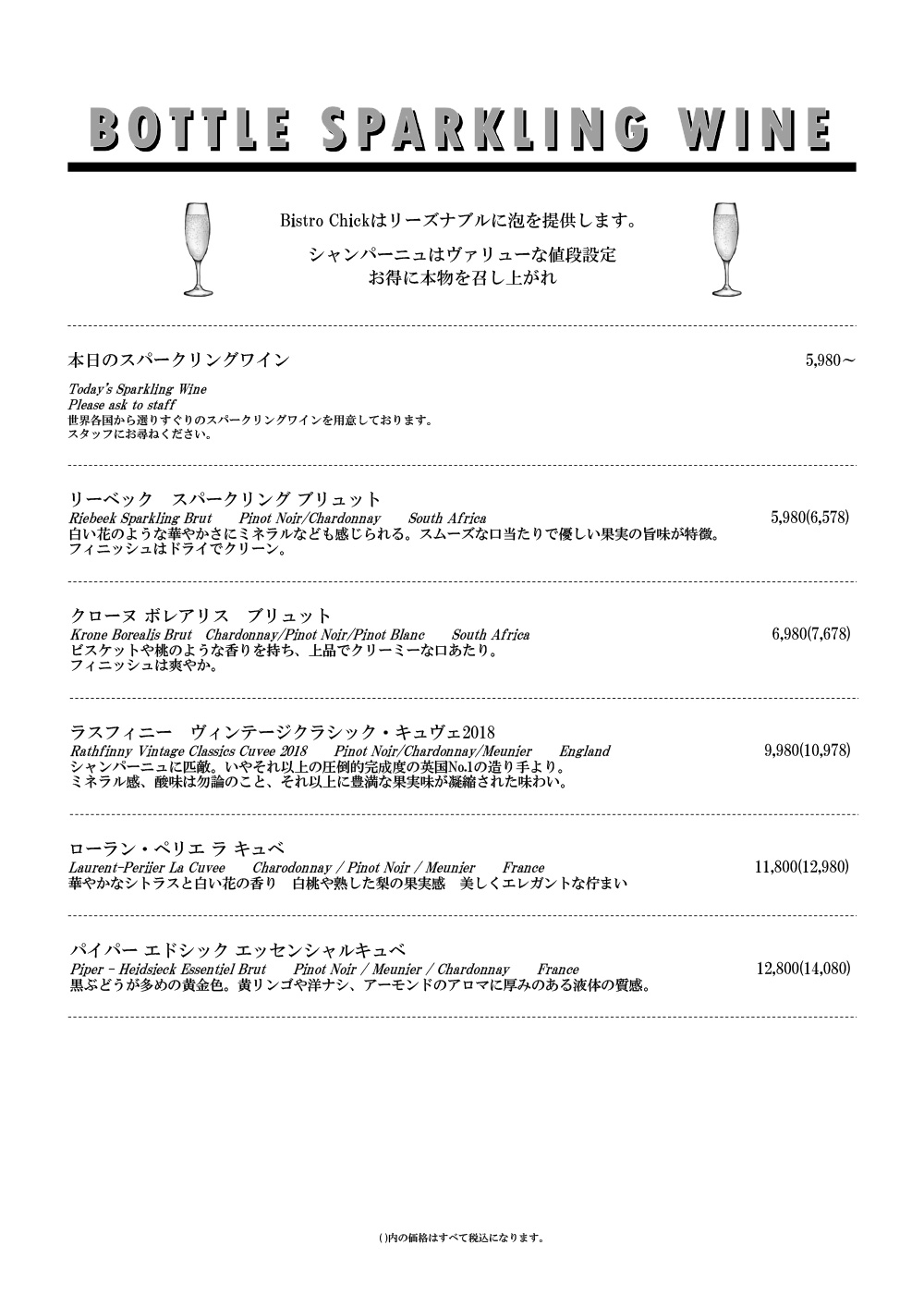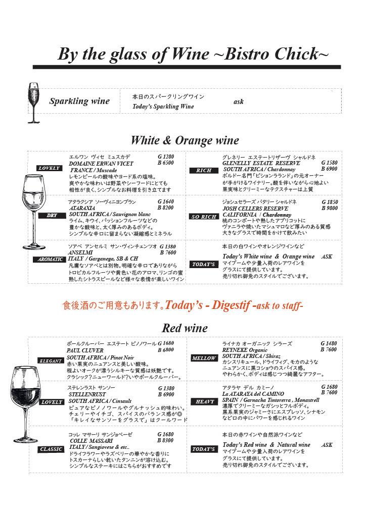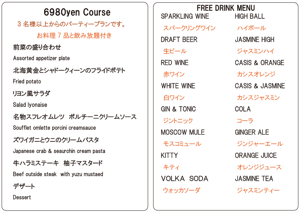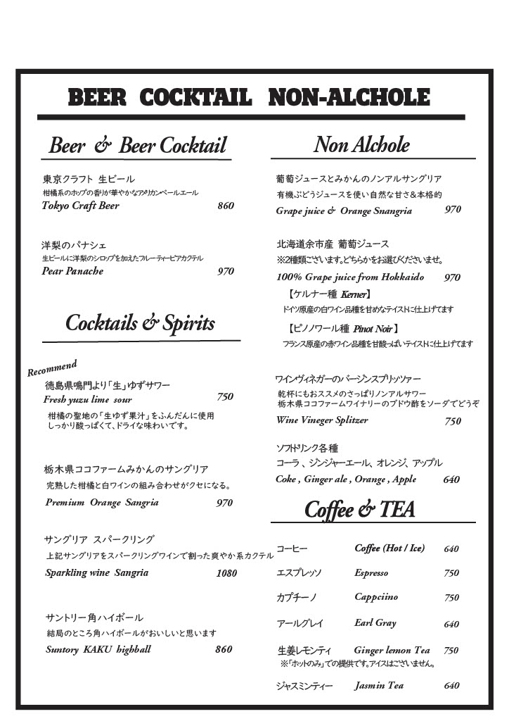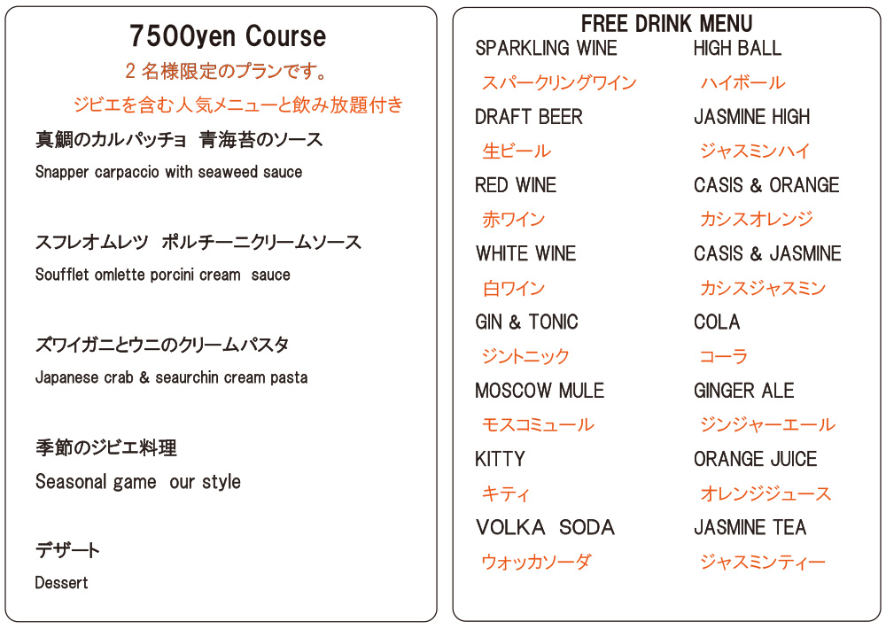 ・ご連絡無しのキャンセルはキャンセル料を頂戴いたします ・ディナータイムのみテーブルチャージお一人様330円を頂戴しております There is a Cover charge of ¥330 per guest.(Dinner time only) ※12歳以下のお子様はチャージ無し。 No Cover charge for children under 12 years old. ※コースにはチャージが含まれております。 Course meals include a Cover charge. ※メニューは季節や仕入れにより変更の可能性がございます。何卒よろしくお願い申し上げます。 The menu is subject to change depending on the season and availability. Thank you for your understanding. |