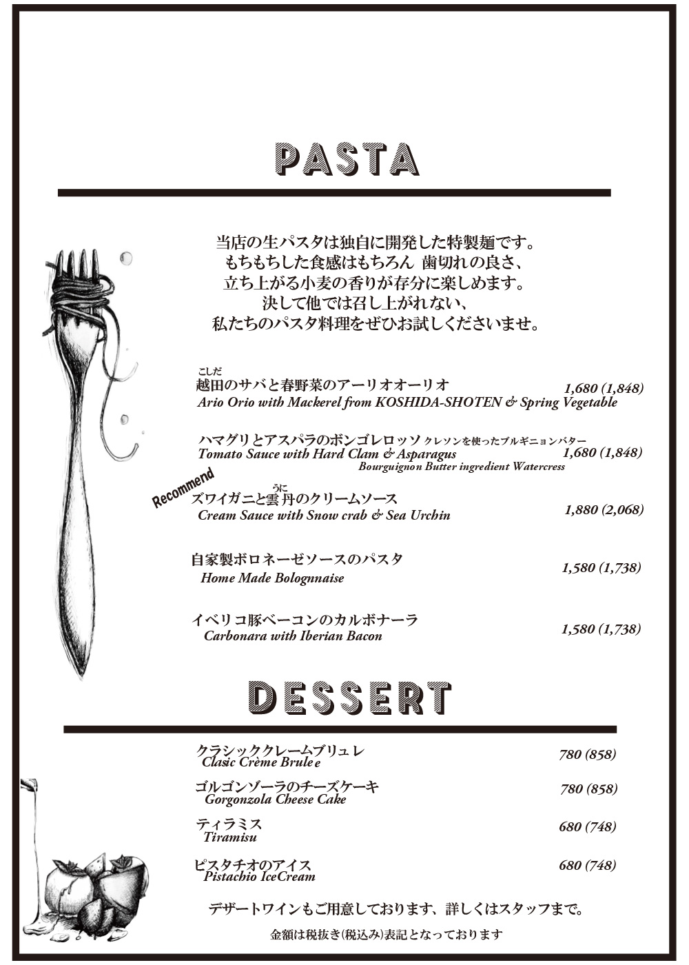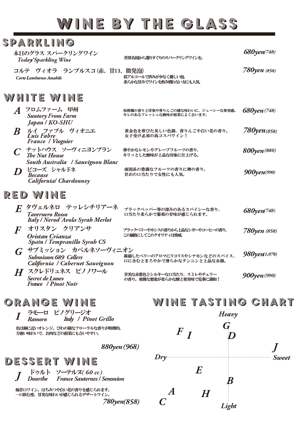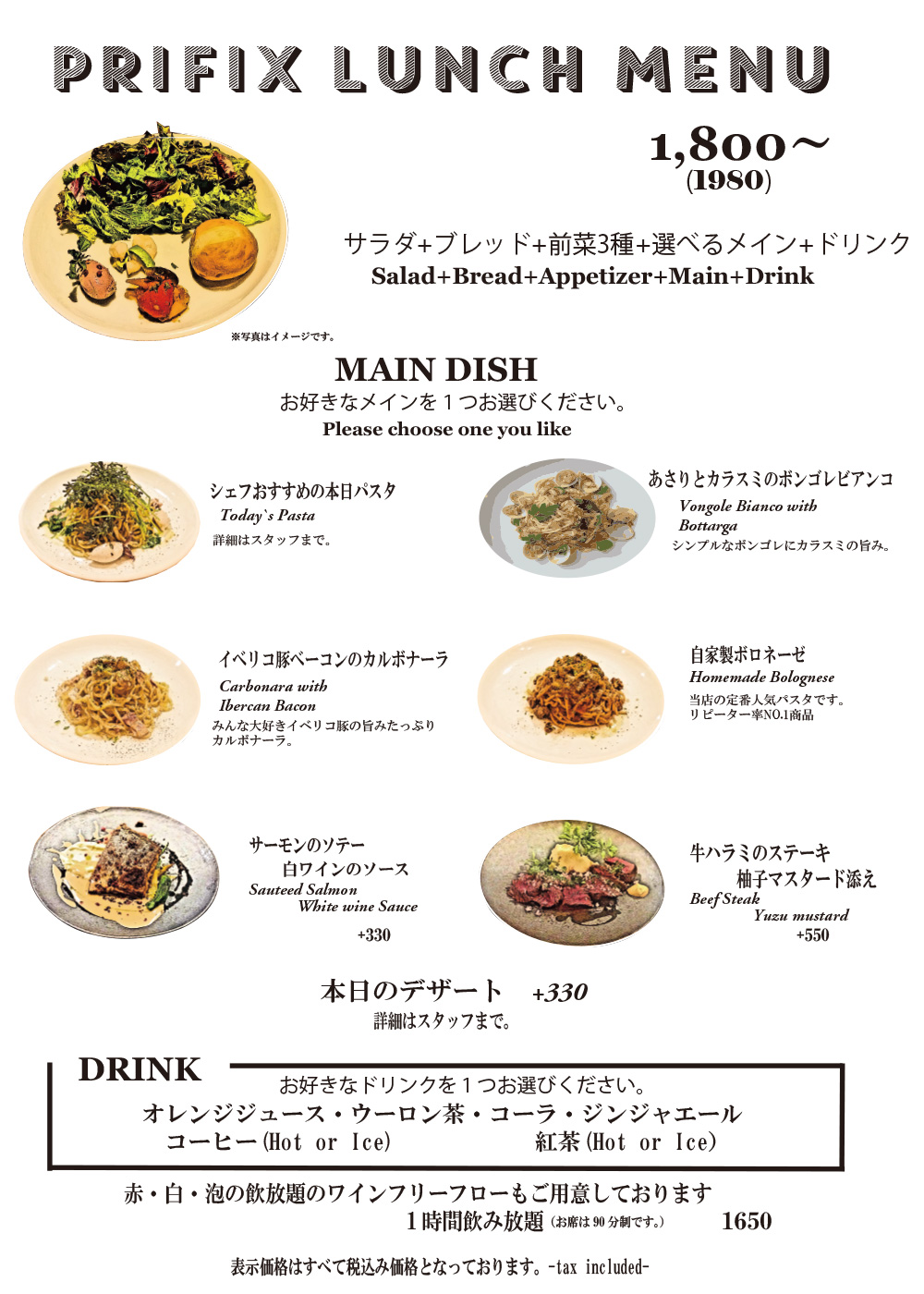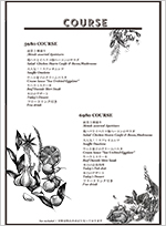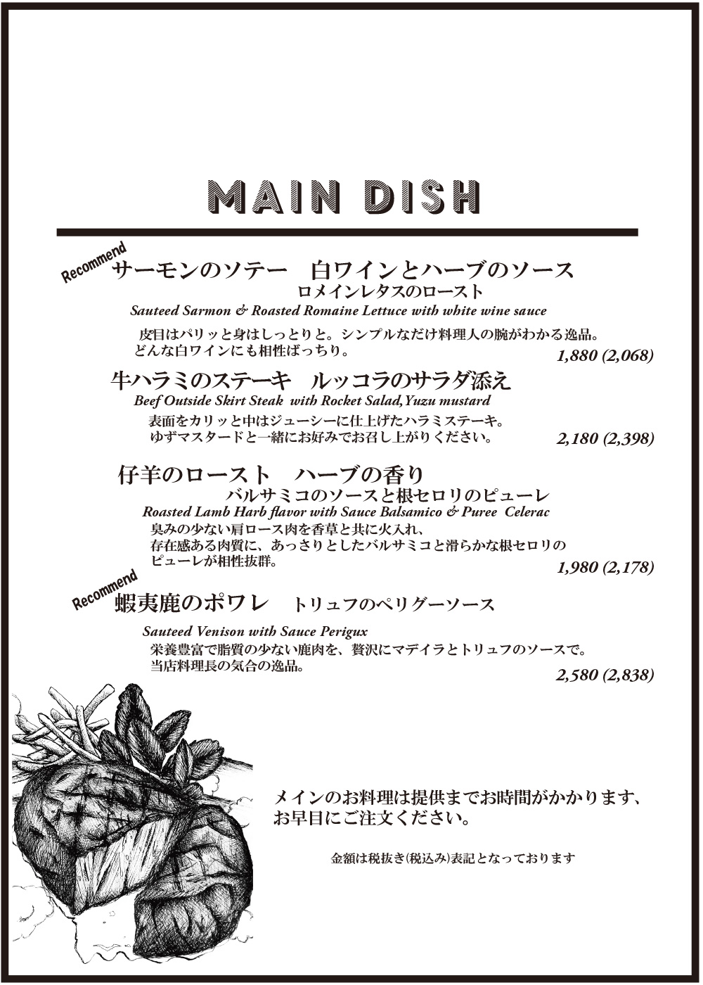 ・ご連絡無しのキャンセルはキャンセル料を頂戴いたします ・ディナータイムのみテーブルチャージお一人様330円を頂戴しております There is a Cover charge of ¥330 per guest.(Dinner time only) ※12歳以下のお子様はチャージ無し No Cover charge for children under 12 years old. ※コースにはチャージが含まれております Course meals include a Cover charge. |