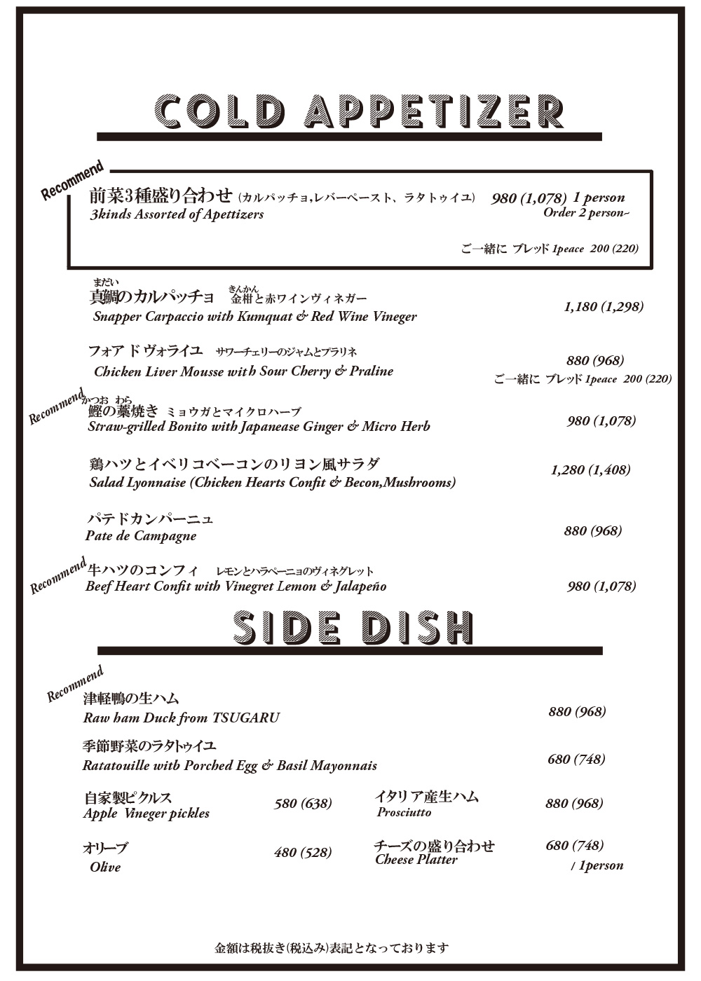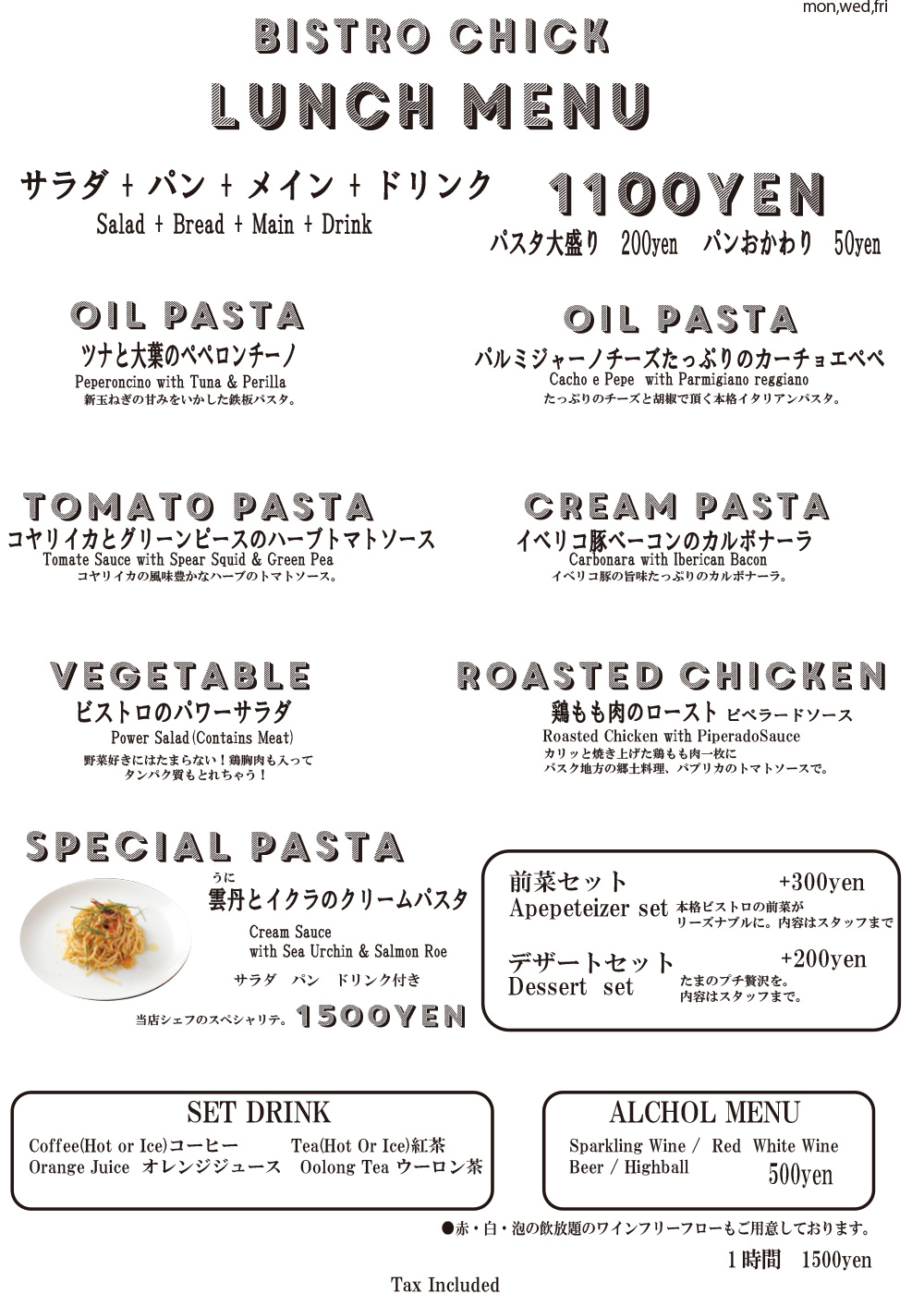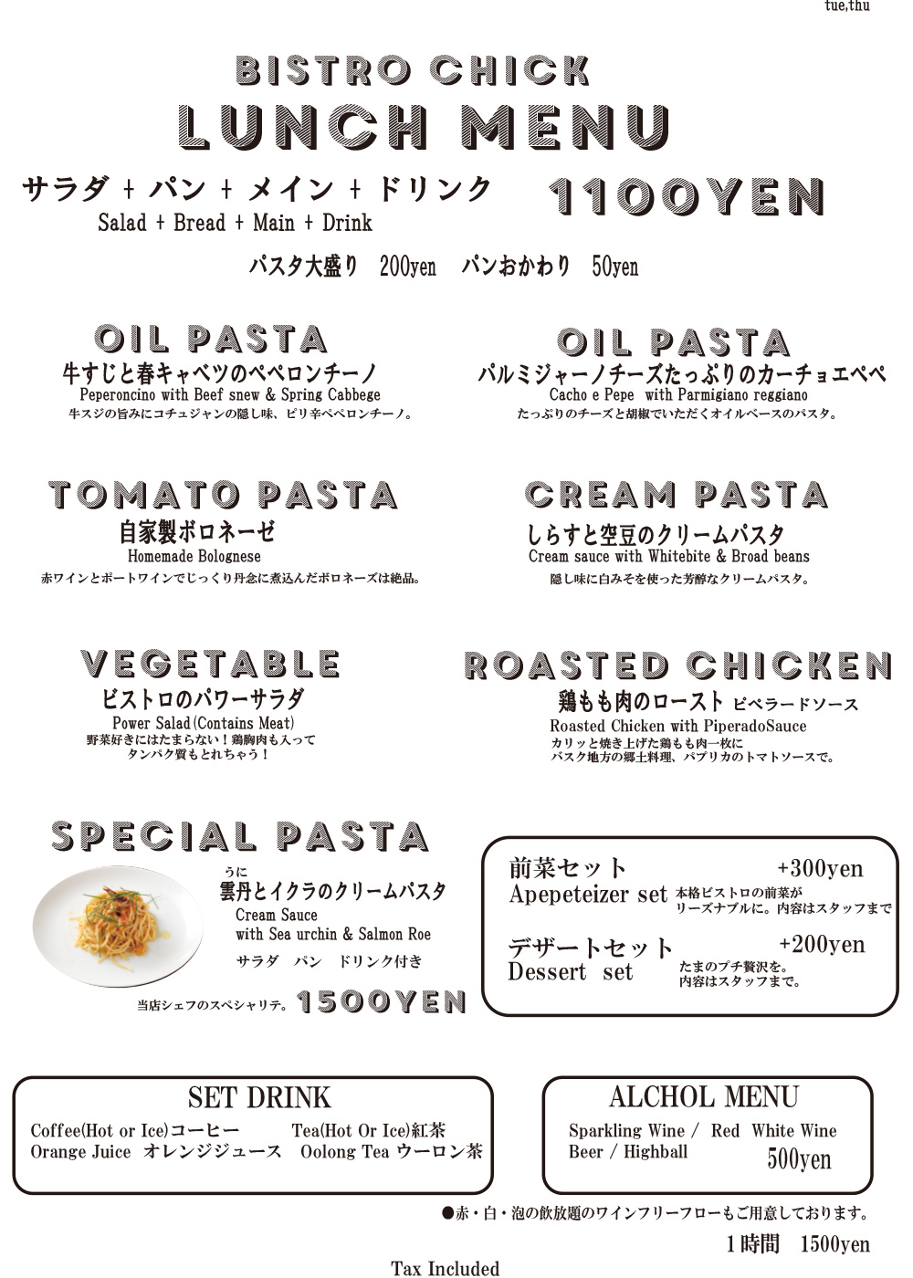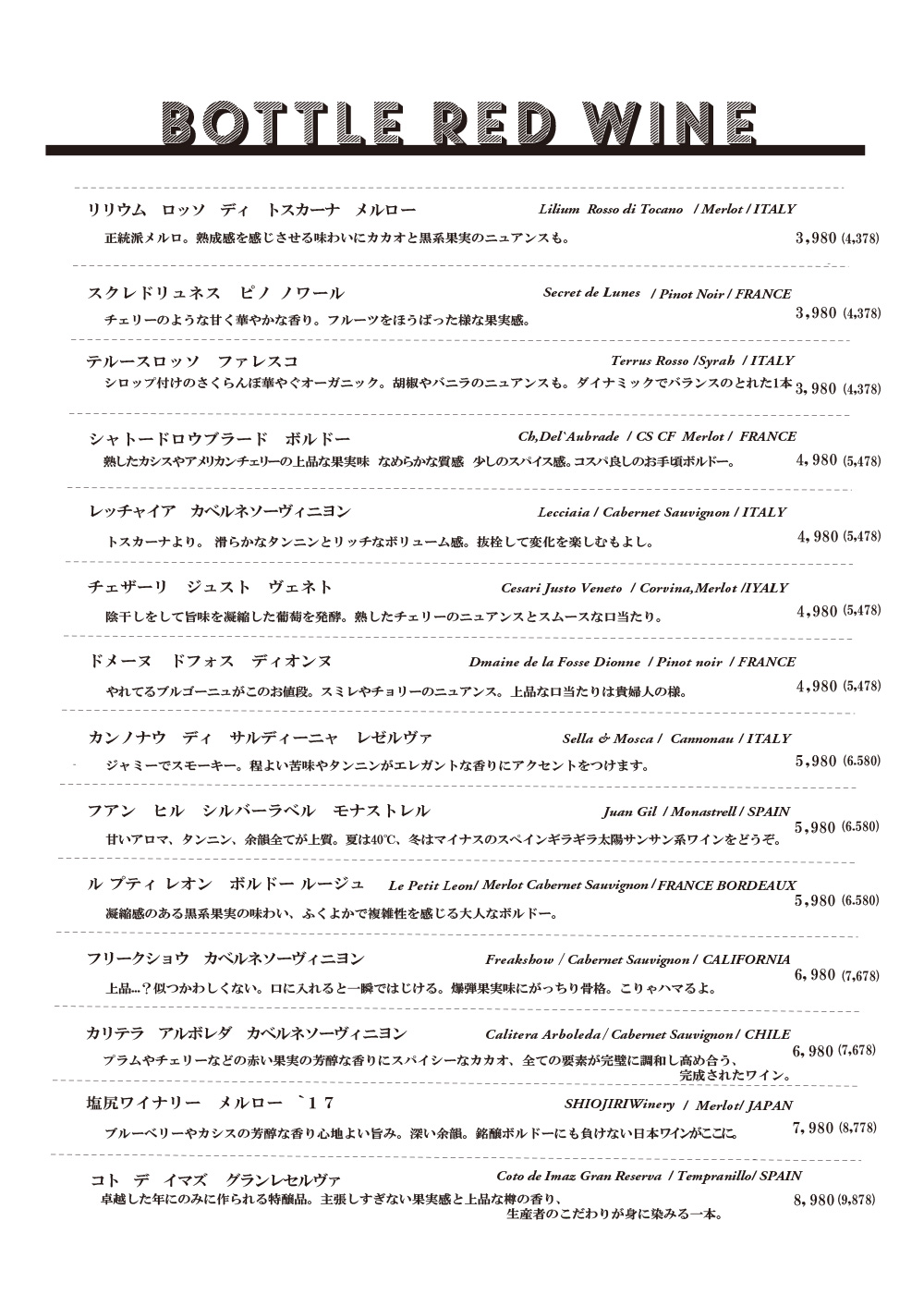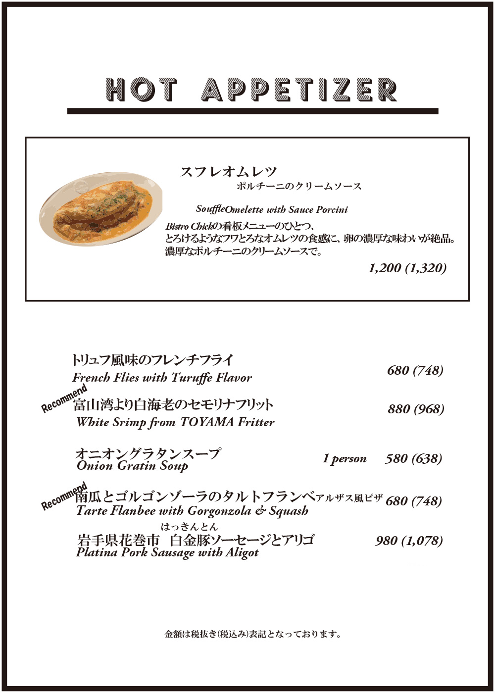 ・ご連絡無しのキャンセルはキャンセル料を頂戴いたします ・ディナータイムのみテーブルチャージお一人様330円を頂戴しております There is a Cover charge of ¥330 per guest.(Dinner time only) ※12歳以下のお子様はチャージ無し No Cover charge for children under 12 years old. ※コースにはチャージが含まれております Course meals include a Cover charge. |
