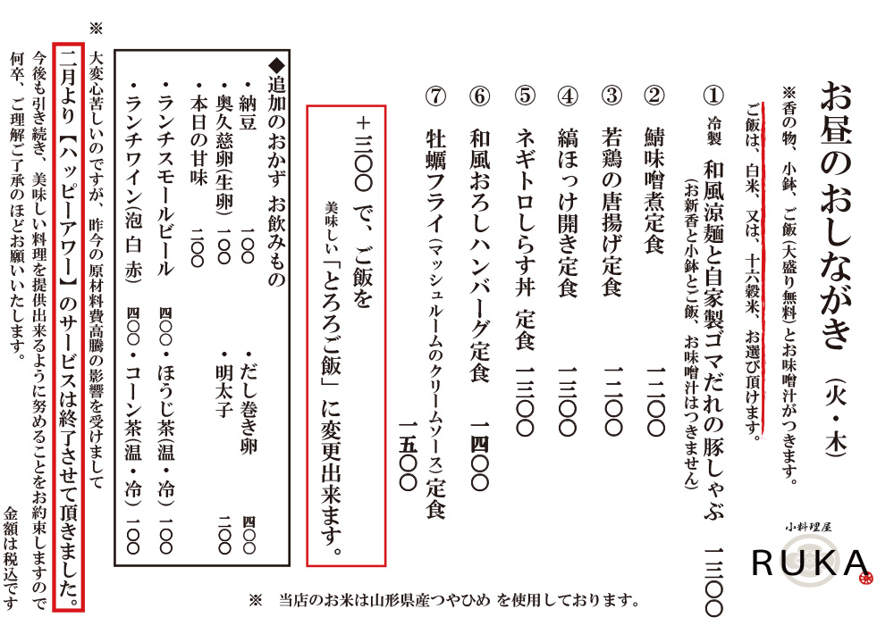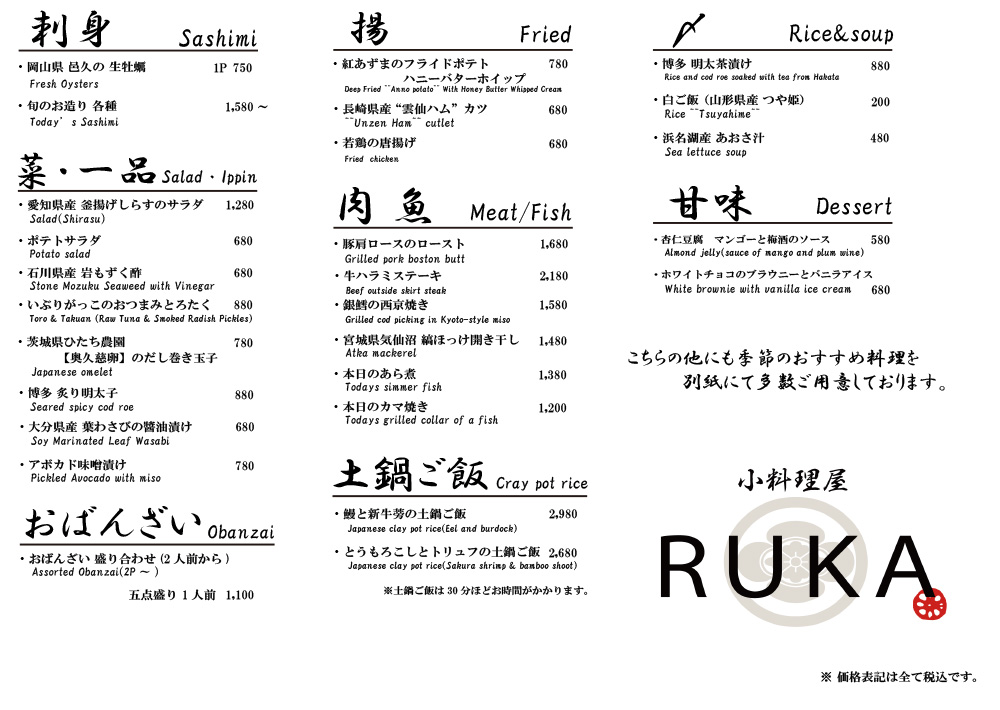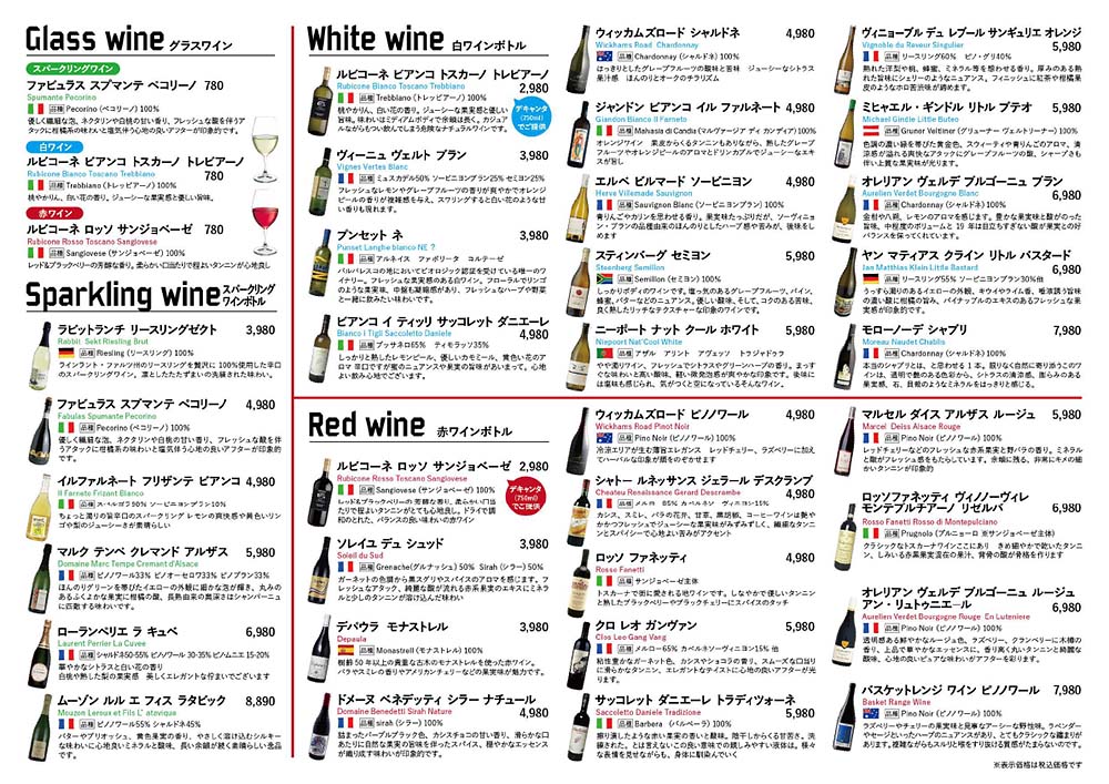 ・ご連絡無しのキャンセルはキャンセル料を頂戴いたします ・ディナータイムのみテーブルチャージお一人様330円を頂戴しております There is a Cover charge of ¥330 per guest.(Dinner time only) ※12歳以下のお子様はチャージ無し No Cover charge for children under 12 years old. ※コースにはチャージが含まれております Course meals include a Cover charge. |